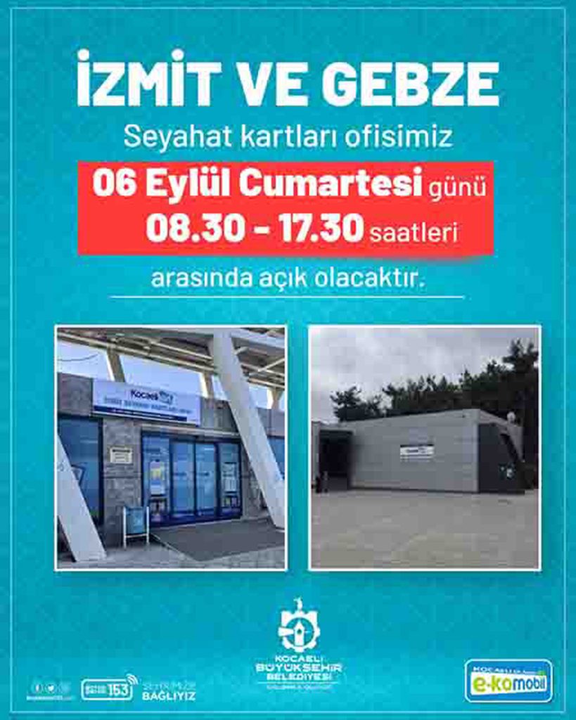 Kocaeli Büyükşehir Belediyesi’nin İzmit ve Gebze’de faaliyet gösteren Seyahat Kart Ofisleri, yeni eğitim yılı öncesinde artan başvuruların hızlı ve konforlu gerçekleşmesi amacıyla 6 Eylül Cumartesi günü (yarın) mesai saatleri içerisinde hizmet verecek. İZMİT VE GEBZE OFİSLERİ AÇIK OLACAK Kocaeli Büyükşehir Belediyesi Ulaşım Dairesi Başkanlığı, yeni eğitim döneminin başlangıcı sebebiyle yaptığı sefer düzenlenmelerine seyahat kart ofislerini […]