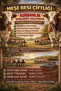 Kartepe Çaloğlu mevki ketence mahallesinde işletmeciğini Ümit ÇEÇEN, MURAT ÇETİN ve diğer aile üyeleri yapan, Meşe Besi Çiftliğinde yeni ürünler yerinden Ağrı’dan geldi.Büyükbaş ve küçükbaş olarak satışlar devam etmekte.Büyükbaş erkek tosunlar bireysel ve hisseli satış,islami şartlara uygun kesim,kesim ve paylama hizmeti,veteriner kontolünden geçmiş geniş otopark alanı ve yeme ve içme hizmeti ve hijyeni ile kusursuz himzet sunmaktalar.